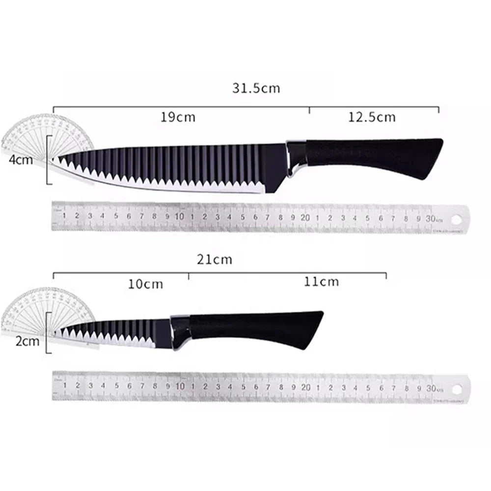 Além das facas, o kit inclui um descascador funcional e uma tesoura 2 em 1, que também serve como abridor de garrafas, oferecendo ainda mais praticidade para o seu dia a dia. O design moderno na cor preta, aliado à alta durabilidade, faz deste conjunto uma escolha indispensável para quem valoriza qualidade e estilo, seja na rotina diária ou no churrasco do fim de semana.